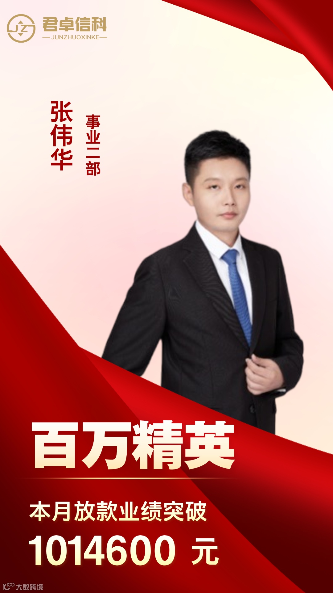 张伟华,君卓信科事业二部业务经理,入职第30天,个人放款额突破100万。