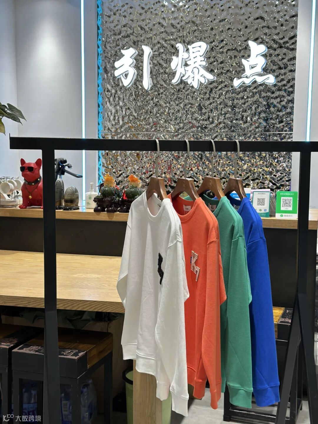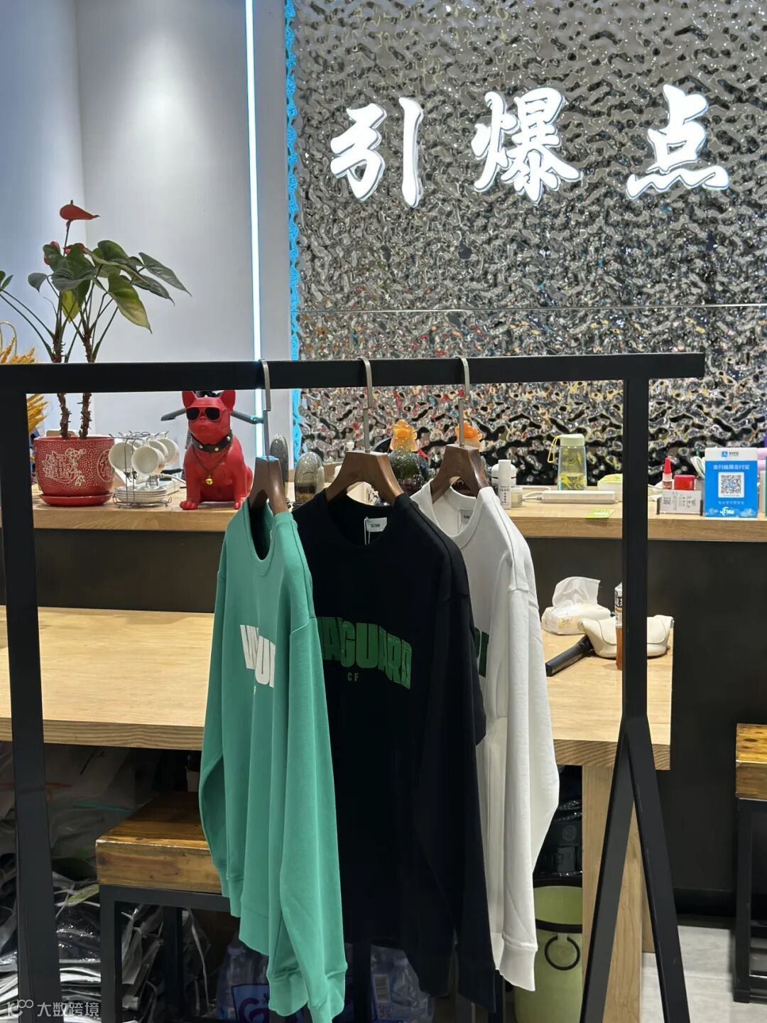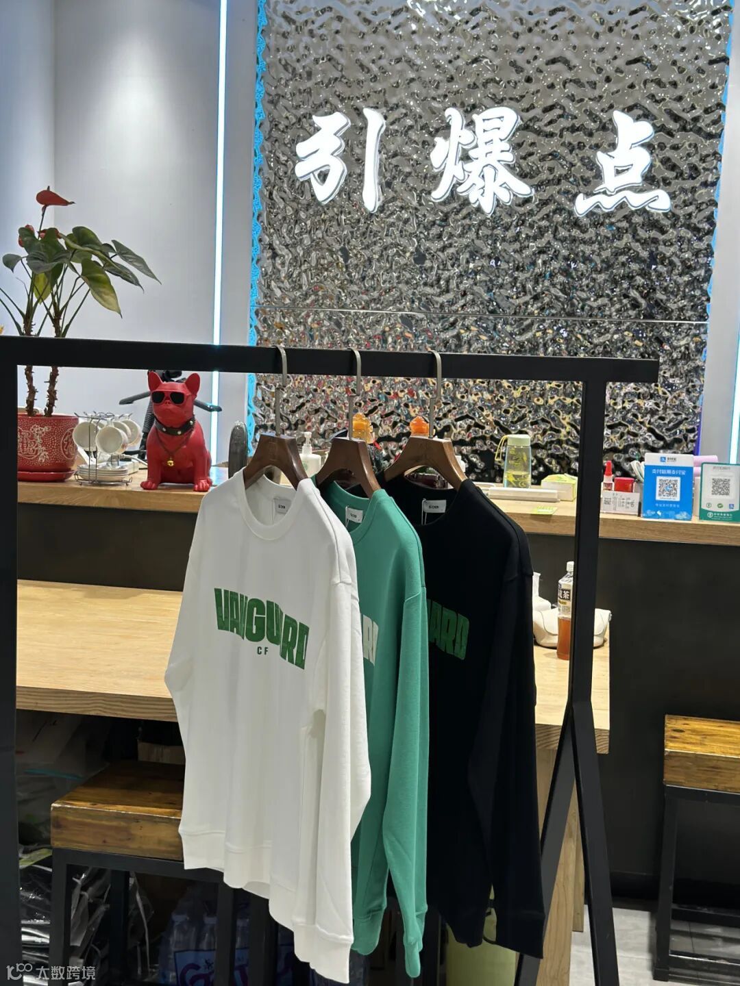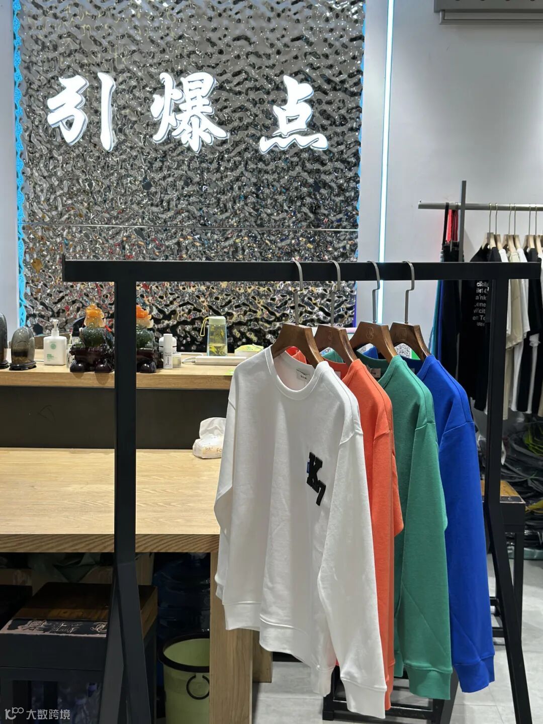 作为一家潮牌折扣尾货店铺,“引爆点”主营男装服装品类,从款式上来看,主打款式有卫衣、加绒卫衣、T恤、毛衣等。
