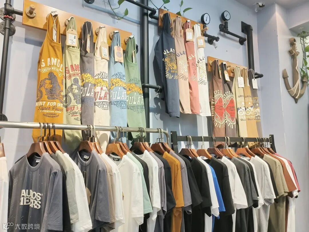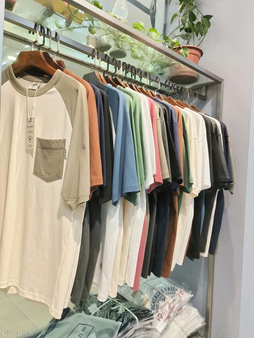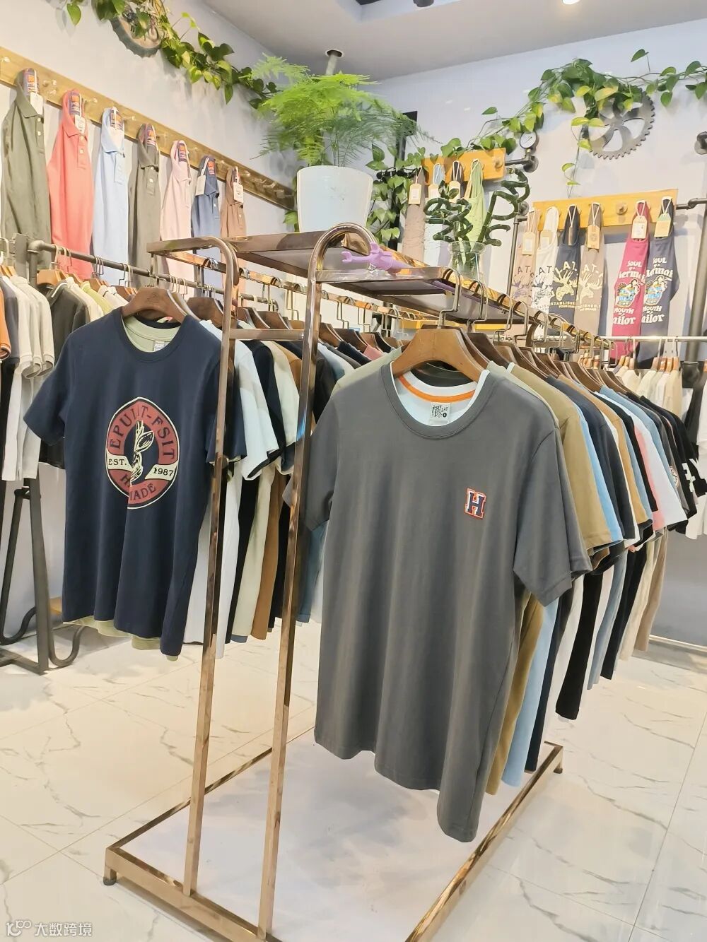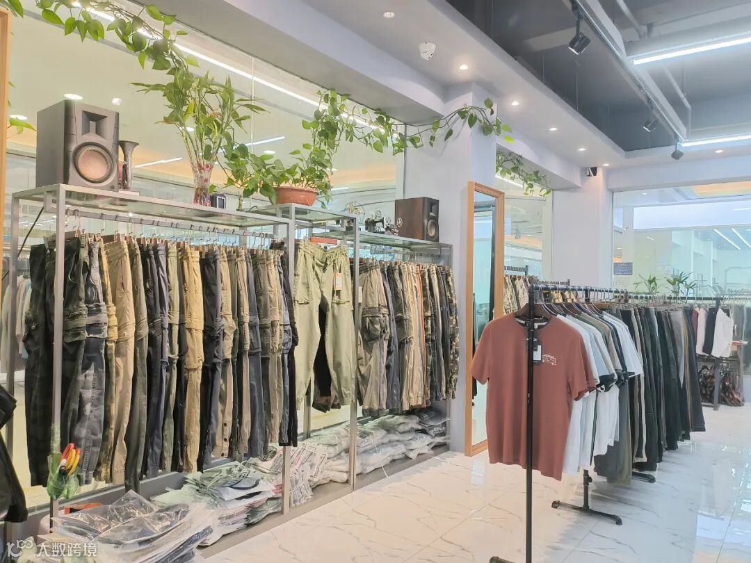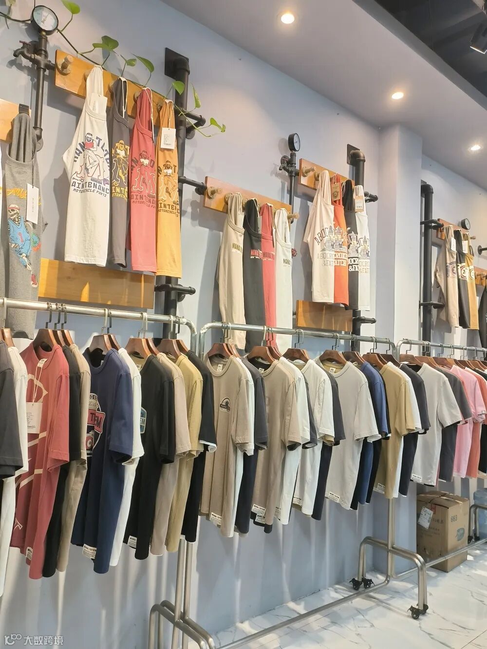 店铺坐落于锦东市场B8栋1211店,开门便可看到浓郁的美式复古装修风格,仿佛穿越了上个世纪。店内利用大量水管、原木、绿叶等材料在墙面进行陈列,划分不同的上衣款式让人眼前一亮,整个店非常有设计感,美式复古足以概括。