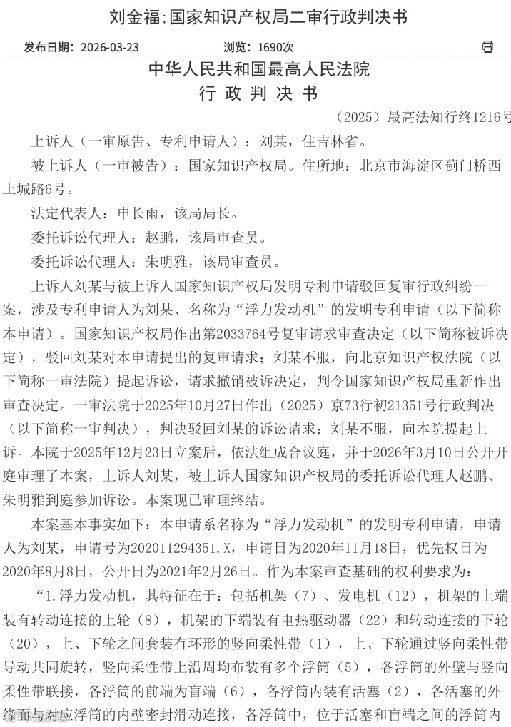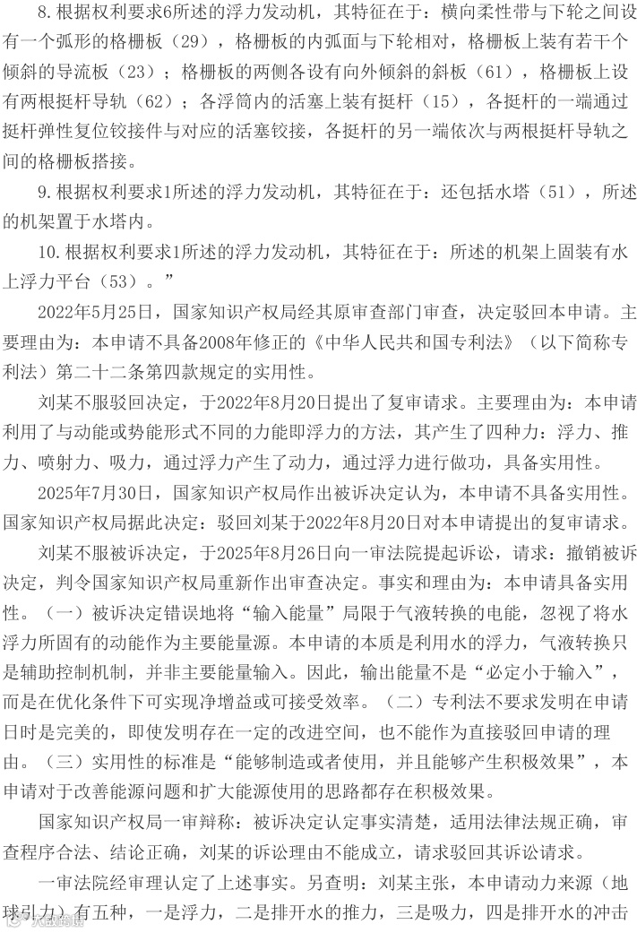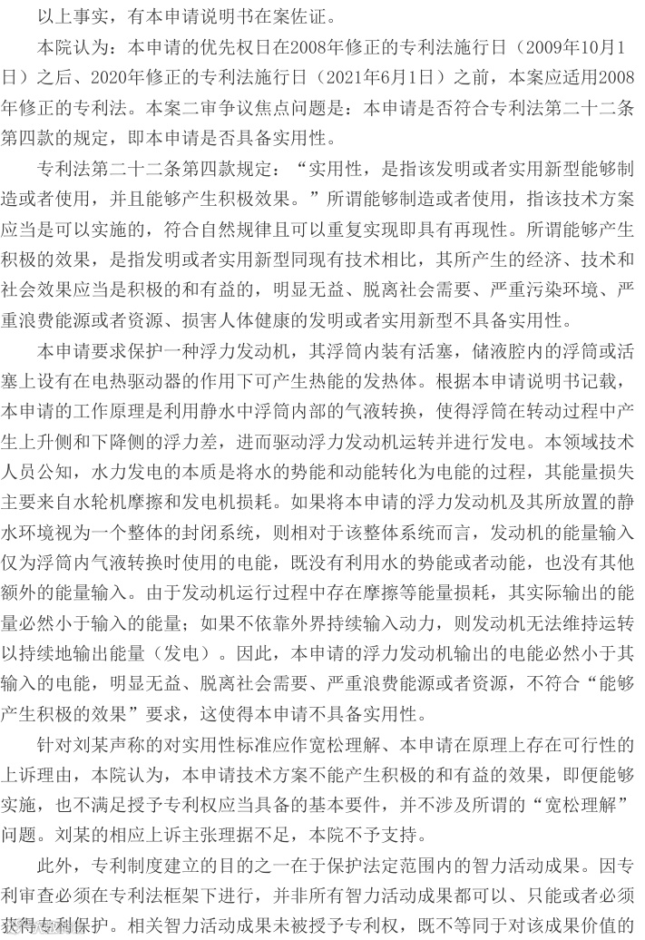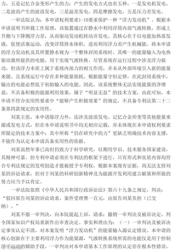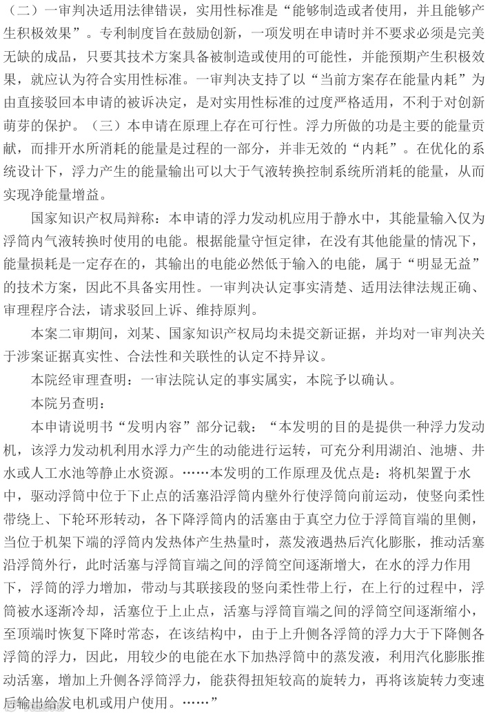 2026年3月17日,最高人民法院终审判决一起发明专利申请驳回复审行政纠纷案。法院认定:在静水环境中运行的浮力发动机仅依靠气液转换电能驱动,未利用水势能或动能等外部能量输入。由于系统存在摩擦等能量损耗,输出电能必然小于输入电能,属于明显无益、严重浪费能源的技术方案,不符合《专利法》第二十二条第四款关于"能够产生积极效果"的实用性要求。最高人民法院驳回上诉人刘某的请求,维持国家知识产权局驳回其专利申请的决定(申请号:202011294351.X)。