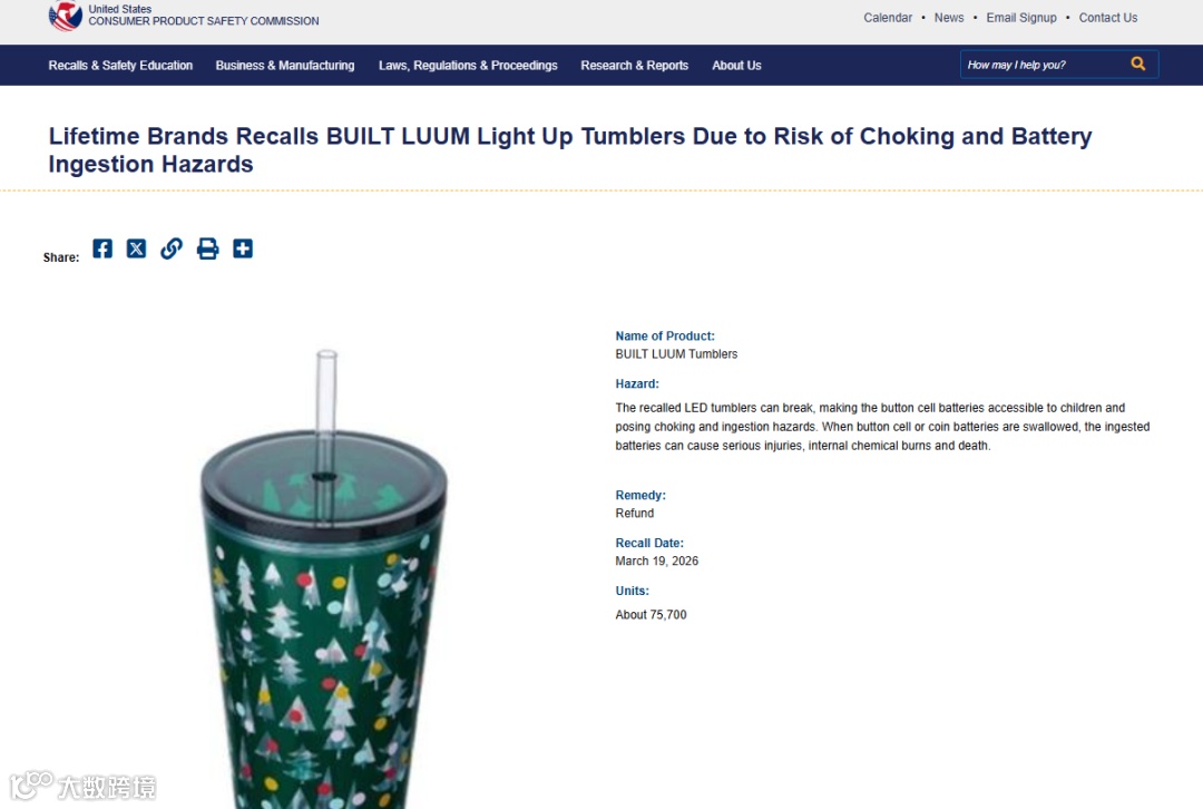 典型案例包括:7.5万个发光水杯因电池仓无防护设计被召回;LED悬浮足球玩具因过热风险要求停用;2024年底260万个不锈钢保温杯因杯盖松动隐患遭批量下架。监管趋势表明,涉及儿童用品、食品接触材料及电池类产品的合规成本正快速攀升。