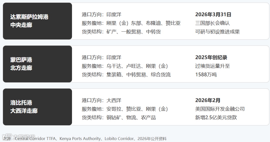 市场货源争夺已提前展开。肯尼亚蒙巴萨港2025年吞吐量达4545万吨,过境货量1588万吨,刚果(金)方向货量持续增长。洛比托走廊获得欧美资金支持,美国国际开发金融公司于2月批准2.5亿美元贷款。东中非腹地货主将根据时间成本与通关效率选择通道。
