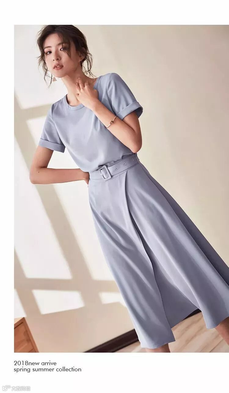 圆领设计,与袖口反折边相呼应,下身以不规则长裙为搭配