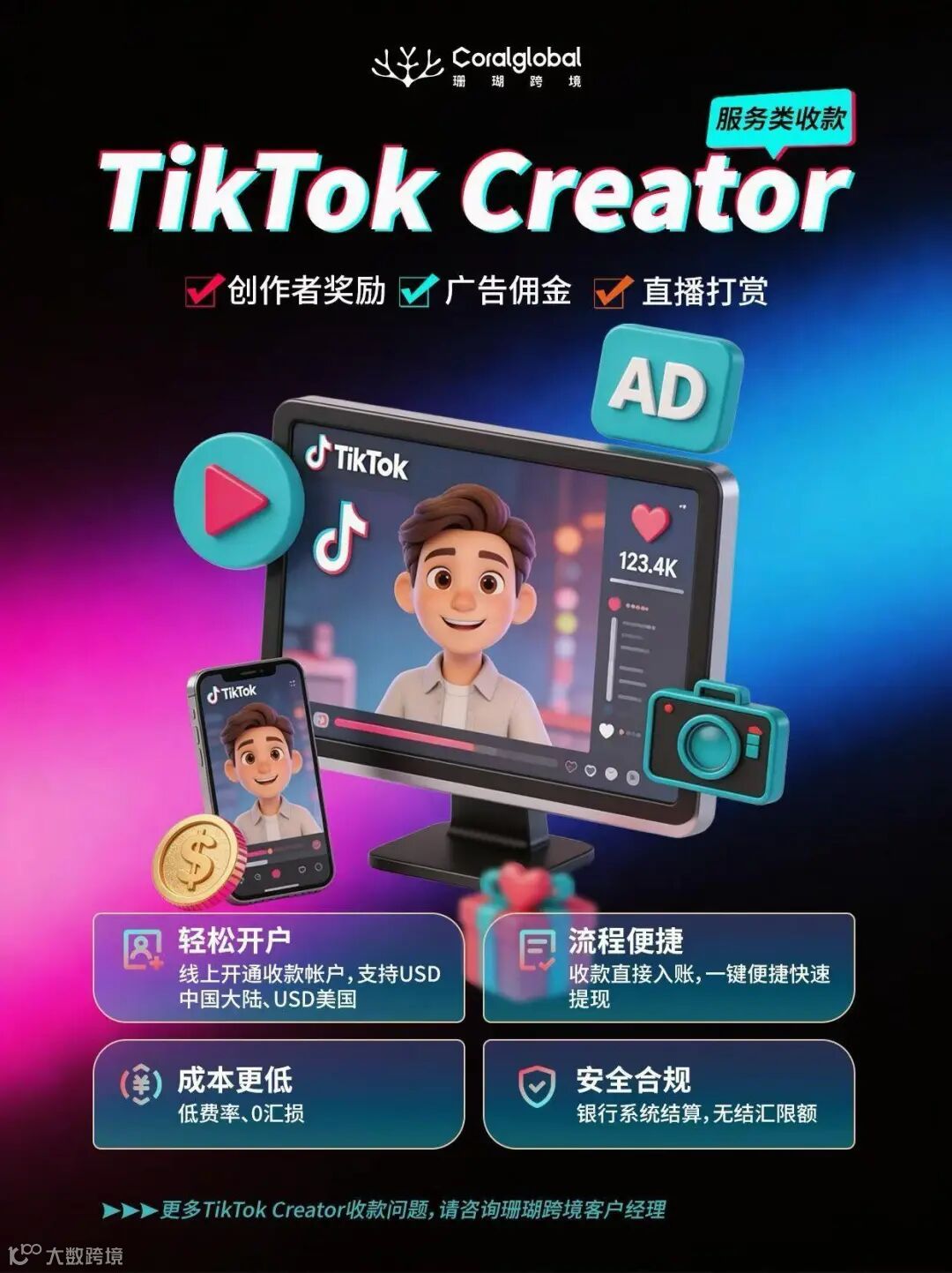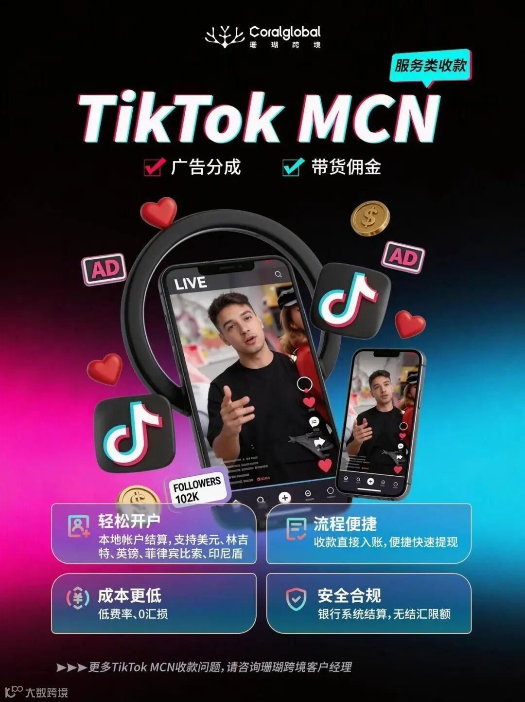 以珊瑚跨境这个第三方支付为例,卖家只需要注册账户并完成实名认证,就可以申请对应的TK小店,TK达人佣金,短视频收益,平台创作收益,广告收益收款账户。账户下来之后,直接在TikTok或MCN机构或TK达人后台绑定即可。后续TikTok结算的外币资金,会进入珊瑚账户中,卖家可以根据实时汇率选择合适时间结汇,随时提现。