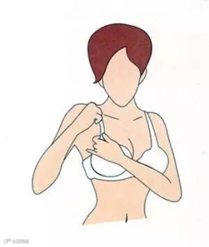 上半身向前倾斜45度,手穿过肩带,让肩带挂在肩上。如果是直挺着站着穿内衣,很难将乳房全部放入罩杯中,最后形成错误穿戴方式,使乳房变形。