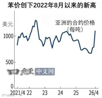 基础化工品苯的亚洲市场价格近期大幅飙升。市场指标ENEOS 4月合约价格(ACP)定于每吨1100美元,较上月暴涨305美元,涨幅38%,创2022年8月以来新高。日元计价达每公斤181.3日元,上涨52.0日元,涨幅40%,已连续三个月上涨。