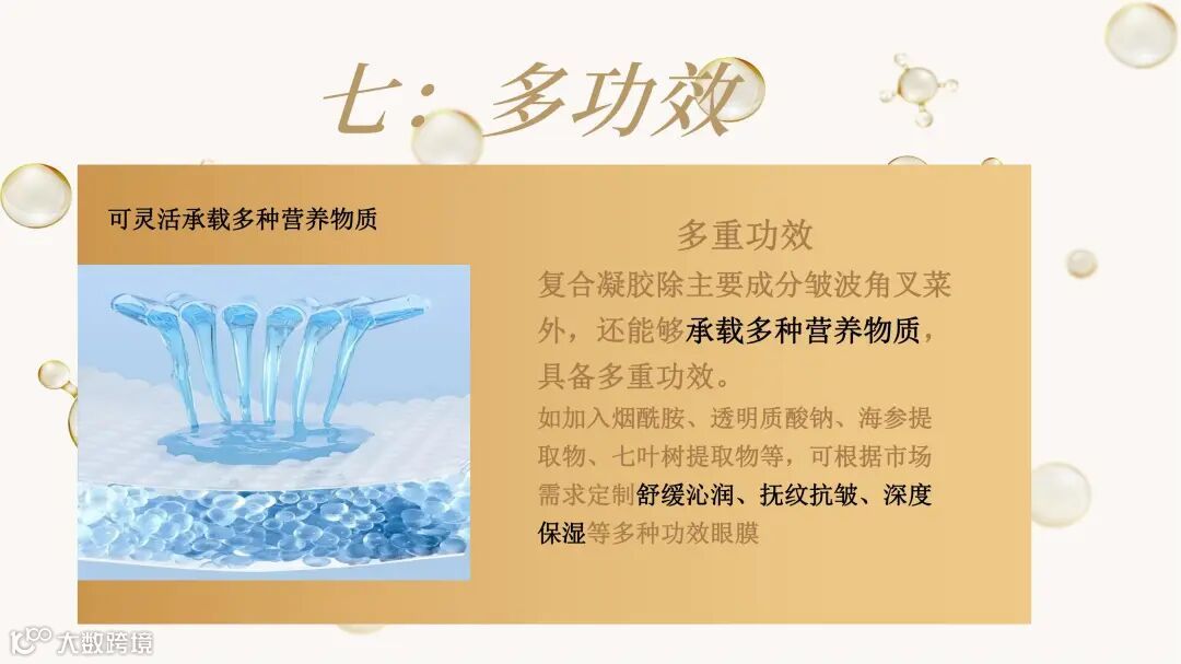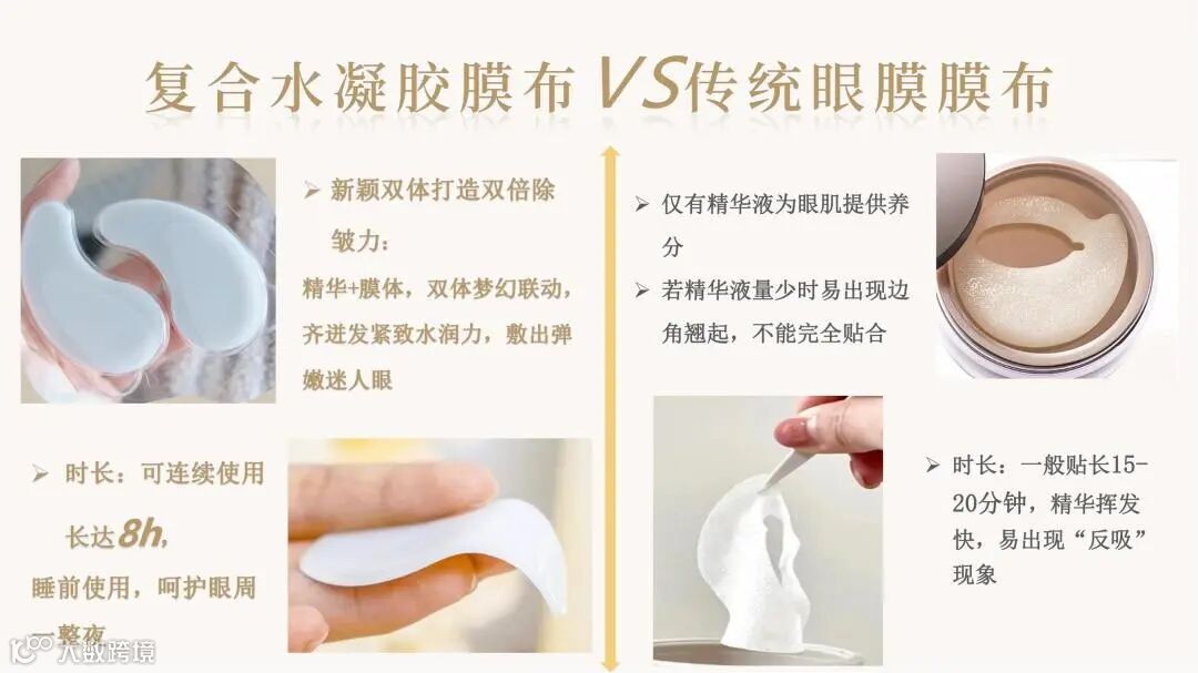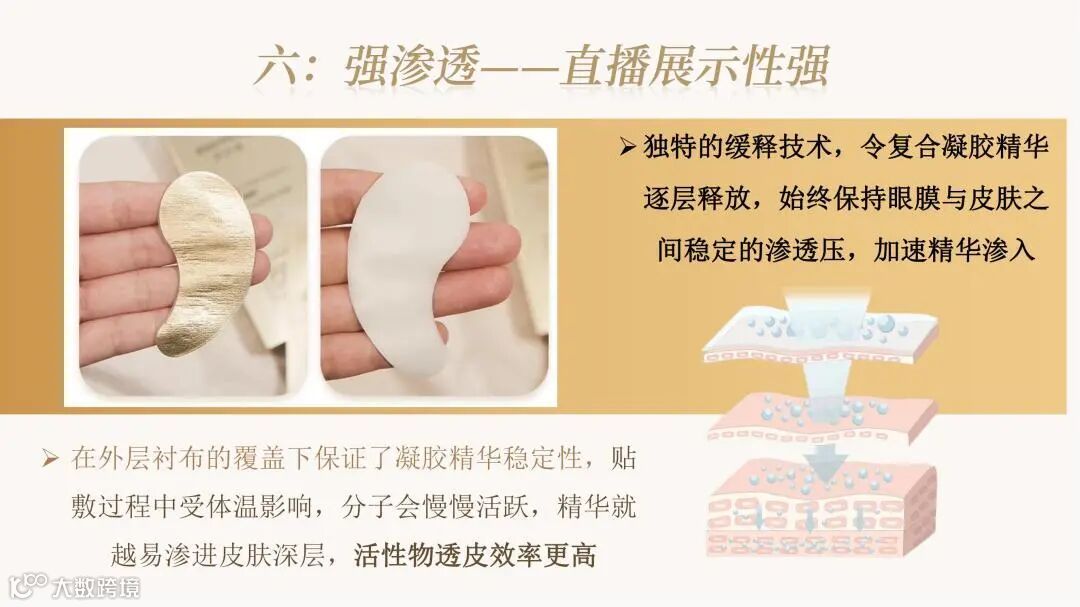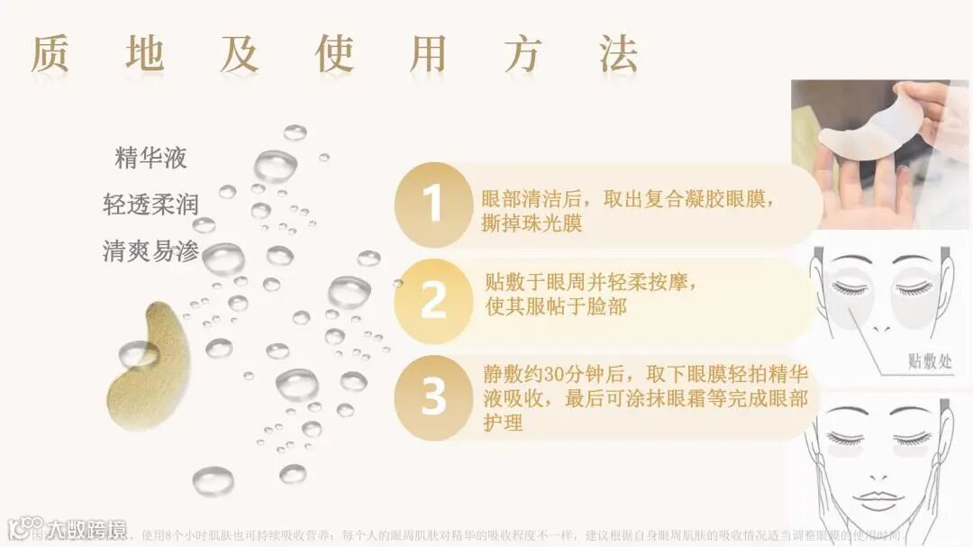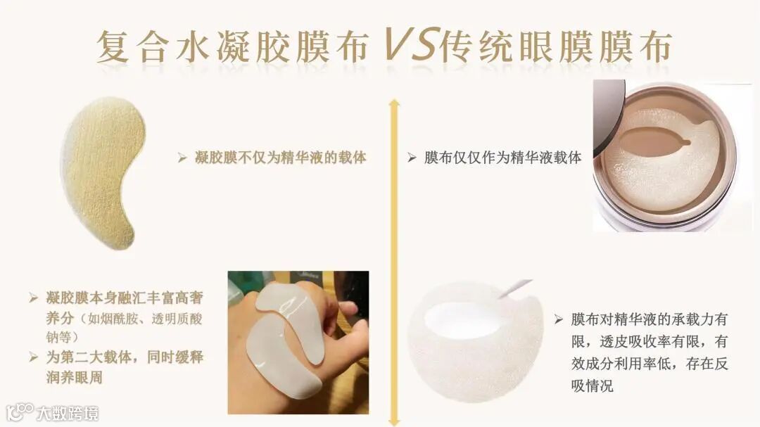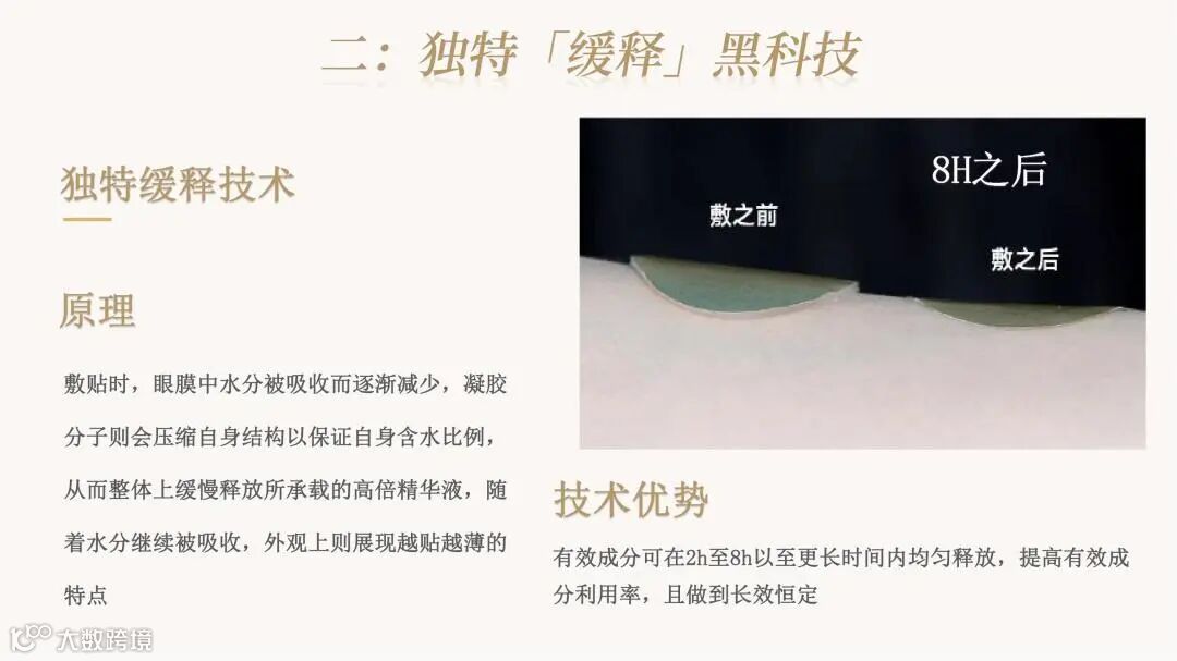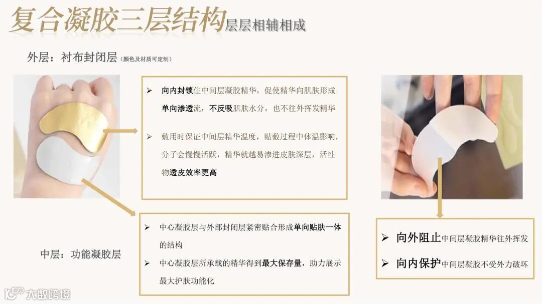 颠覆传统眼膜利用无纺布、蚕丝等载体吸附精华的方式,利用融合水凝胶技术,将精华制成三维网状物理交联的固体形态。精华厚度可达数毫米,可添加多种营养物质,具备多重功效。