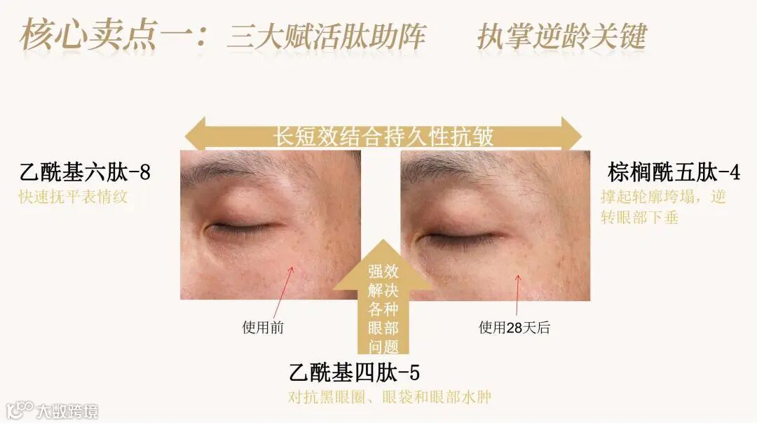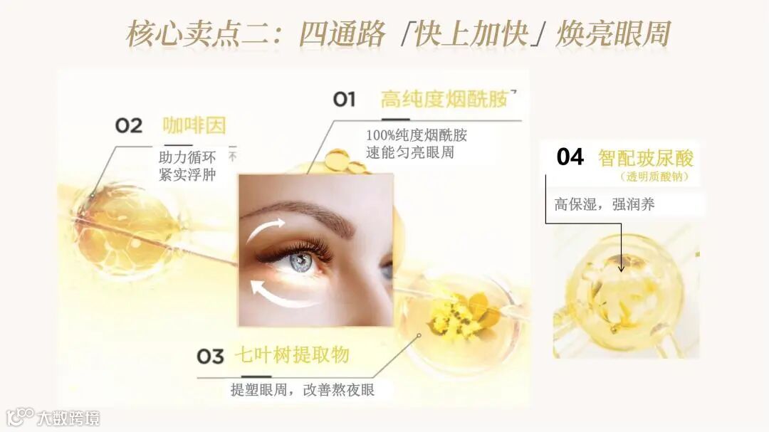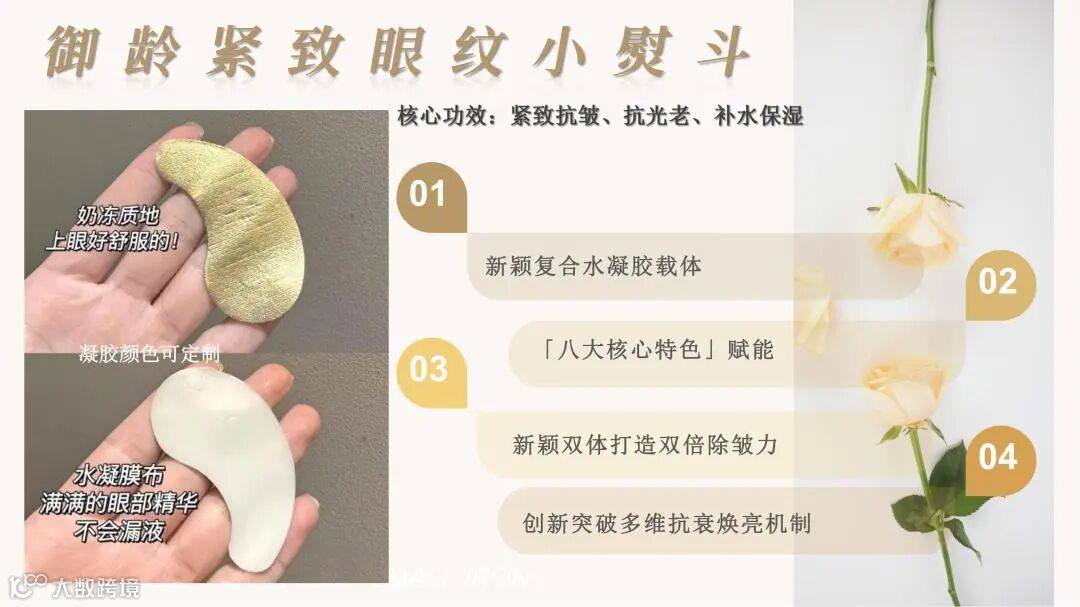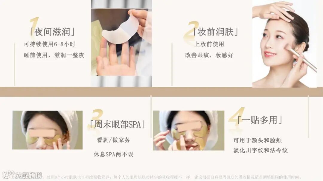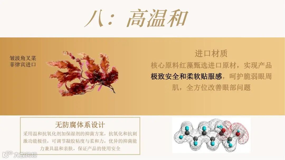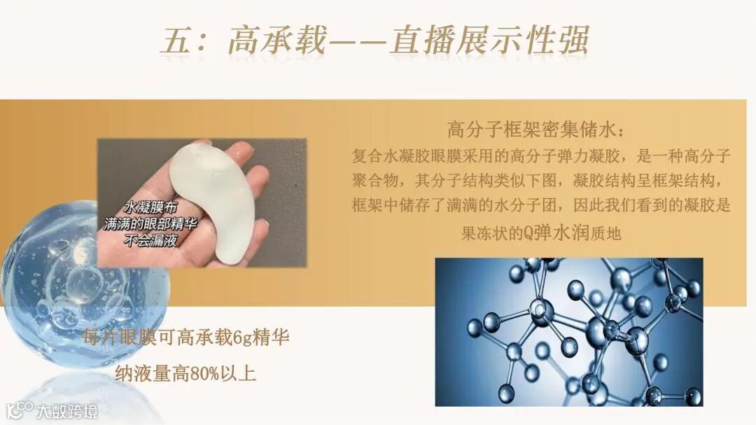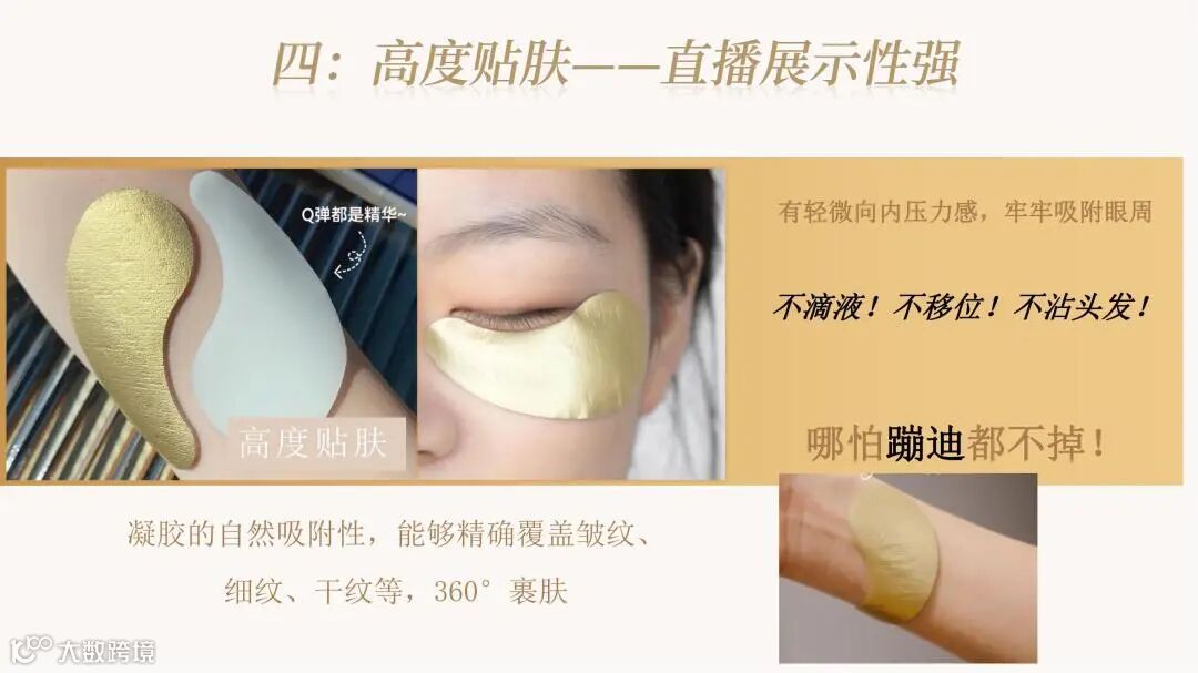 颠覆传统眼膜利用无纺布、蚕丝等载体吸附精华的方式,利用融合水凝胶技术,将精华制成三维网状物理交联的固体形态。精华厚度可达数毫米,可添加多种营养物质,具备多重功效。