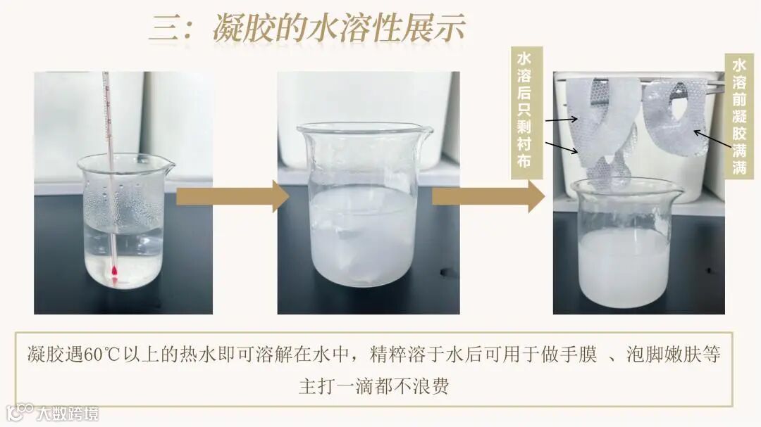 具有强大的凝集水分功能,它以水为分散介质,当把凝胶贴到皮肤上时,凝胶内部的物理结构因受体温影响,从固态变成液态,并渗透到皮肤里,故其精华转化率高。