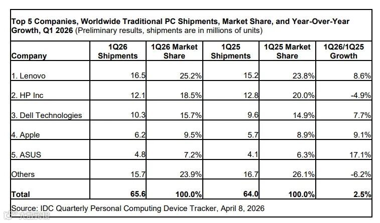 IDC报告:联想Q1全球PC市占率25.2% 领跑行业增速