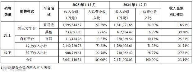 安克创新稳步推进“线上+线下”全渠道战略,2025年线上渠道营收214.27亿元。其中,亚马逊平台贡献159.55亿元,占总营收52.29%;官网实现收入31.35亿元,同比增长25.21%。