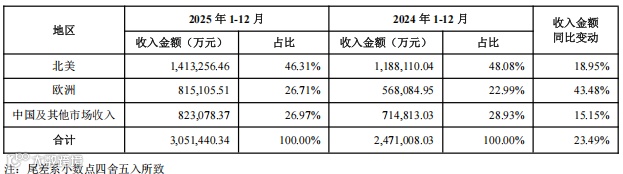 区域市场方面,北美营收141.32亿元(占比46.31%),欧洲营收81.51亿元(占比26.71%),中国及其他市场营收82.30亿元(占比26.97%)。欧洲市场占比稳步提升,北美份额小幅回落。