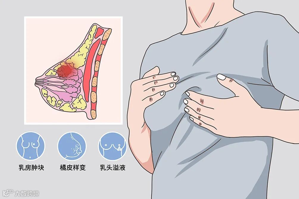 乳腺癌早期症状不明显,容易被忽视而未进行及时就医。因此,高危人群(如乳腺癌家族史者、未生育者或生育晚者等)应及时定期筛查,一旦发现乳房有肿块、溢液、淋巴结肿大等异常症状及时就医。