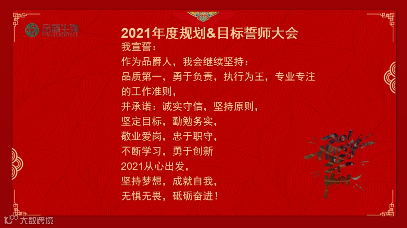 2021年1月23日下午,品爵生物以“凝心聚力 攻坚克难 砥砺奋进”为主题,开启了过去一年的总结与新一年目标计划,誓师大会在这一刻拉开了序幕。