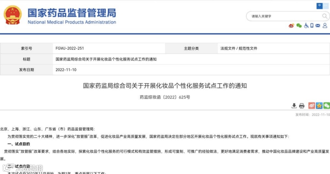 导读:2022年11月10日,国家药监局在北京、上海、浙江、山东、广东省的部分地区,开展为期1年的化妆品个性化服务