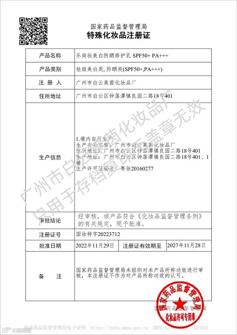 莱茵化妆品厂研发的乐尚妆美白防晒修护乳SPF50+ PA+++通过食药监祛斑美白类+防晒类双特证认证,并持有中山大学附属第三医院化妆品评价中心、苏州国辰生物科技股份有限公司权威第三方检验报告。人体安全性和功效评价检验结果:SPF56、PFA13。欢迎各位老板咨询定制生产或独家经营。