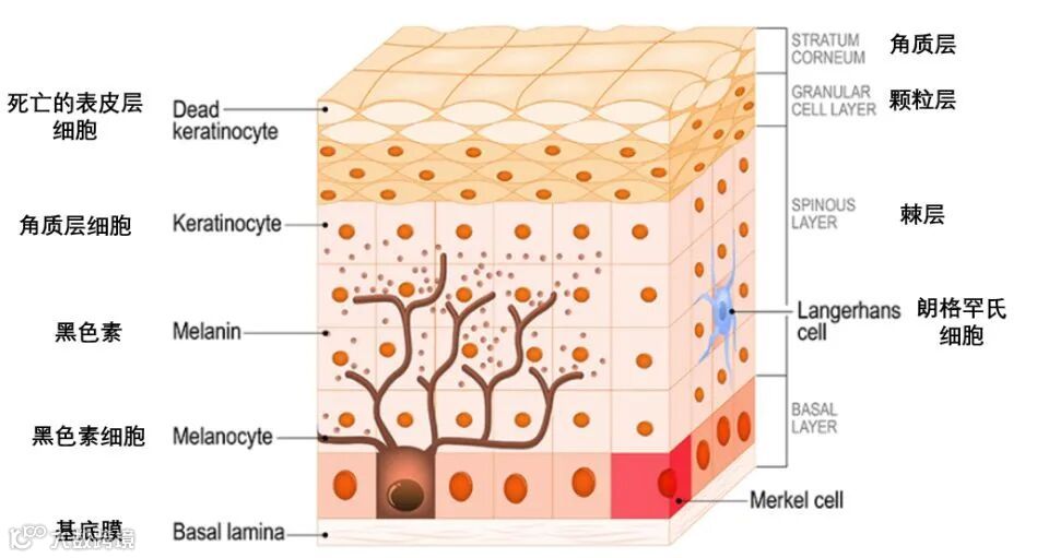 我们都知道,皮肤表皮由内而外分别是基底层、有棘层、颗粒层、(透明层、)角质层。从基底层到角质层一共需要14天时间,然后待在角质层14天才会自然脱落。也就是说,日常使用美白产品,2-4周后才见效是正常的。随着年龄的增加,新陈代谢的过程会变得缓慢,这个周期也会逐渐延长。当皮肤过分曝晒于紫外线下,自由基便会活跃起来,刺激到酪氨酸酵素时,黑色素就会堆积在皮肤表皮层中。所以,祛斑的关键也要做好防晒,减少了黑色素生成。