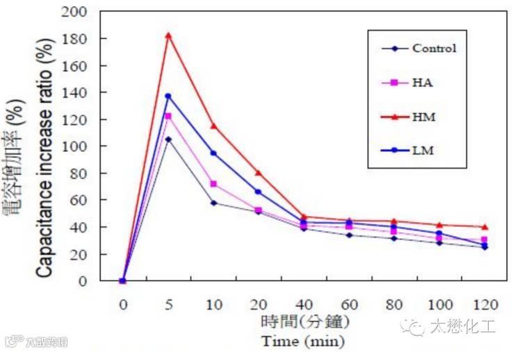 涂抹含有0.05%不同分子量的γ-PGA—高分子(HM)及低分子(LM)、HA的保湿霜后,在23℃,相对湿度60%下,测试电容增加率的改变。