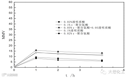在本实验条件下:( 0.05%γ-聚谷氨酸+0.05%透明质酸)复配物质作为保湿剂样品的保湿性能优于 0.1%γ-聚谷氨酸或 0.1%透明质酸的保湿性能。 低浓度( 0.02%)时, γ-聚谷氨酸的保湿性能优于透明质酸;较高浓度( 0.1%)时,在短时间( 1 小时)内,透明质酸保湿性能优于 γ-聚谷氨酸,较长时间( 2 小时、 4 小时), γ-聚谷氨酸的保湿性能优于透明质酸。