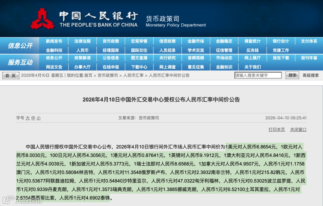 2026年4月10日银行间外汇市场人民币汇率中间价(来源:中国人民银行):