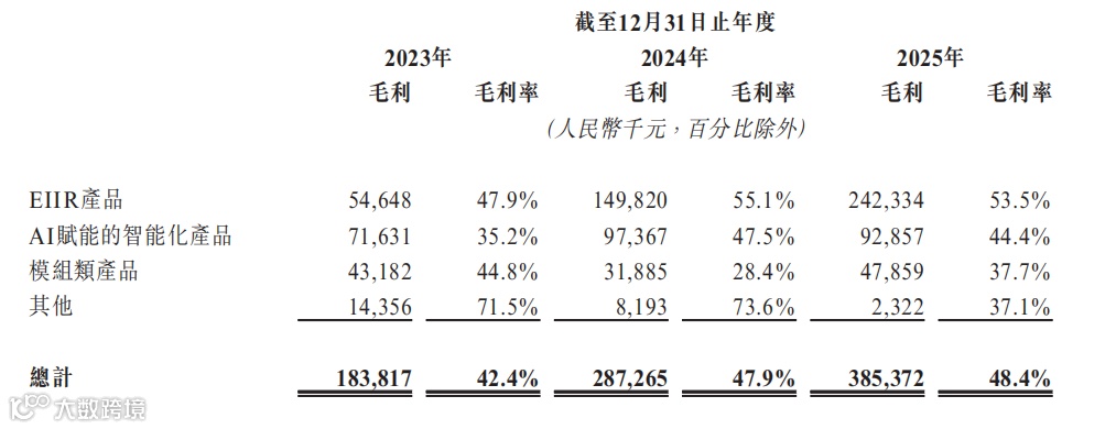 收入结构实现质变:核心产品工业具身智能机器人(EIIR)销量从2023年211台增至2025年623台,收入从1.14亿元飙升至4.53亿元,三年复合增速近100%。EIIR营收占比从26.3%跃升至57.0%,带动毛利率由47.9%升至53.5%,凸显高溢价能力与规模效应。