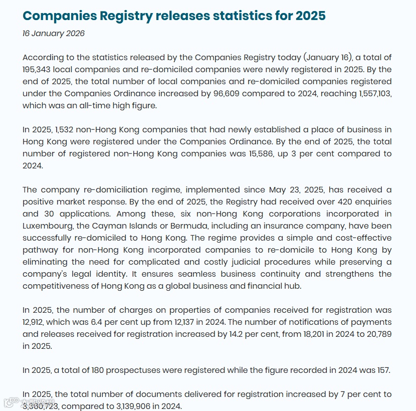 2025年数据显示,香港新注册及迁册公司达195,343家,总量创1,557,103家历史新高;迁册制度(2025年5月实施)至年底收到30宗申请,6家完成迁册。截至2026年2月,检控数据表明前两个月已发出556张传票,罚款总额244.27万港元。