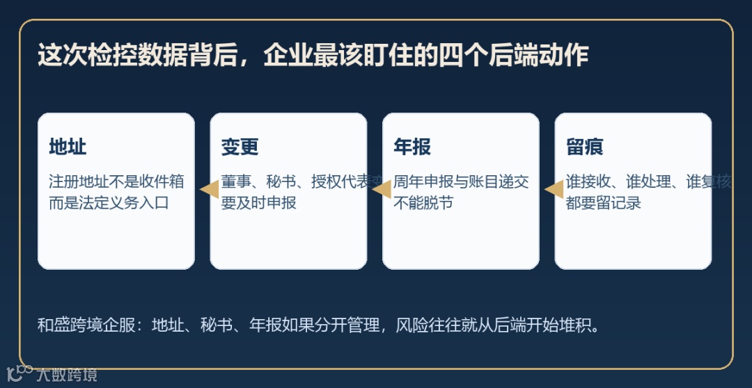 跨境企业需聚焦后端管理,公司数量激增与迁册增加将加剧注册地址、秘书变更及周年申报等环节的监管频次。
