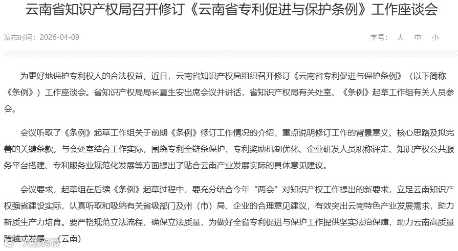 近日,云南省知识产权局召开《云南省专利促进与保护条例》(简称《条例》)修订工作座谈会。