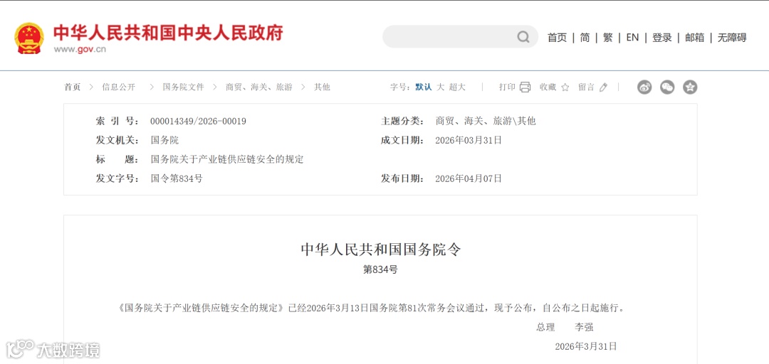 4月7日,国务院总理李强日前签署国务院令,公布《国务院关于产业链供应链安全的规定》(以下简称《规定》),自公布之日起施行。