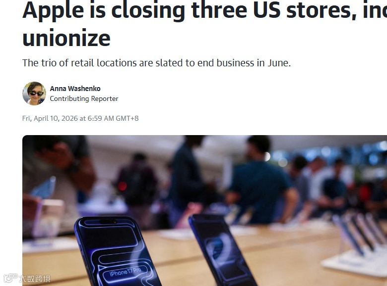 【环球网科技综合报道】4月10日,苹果公司宣布将于夏季关闭三家美国零售店,包括全美首家与工会签订集体协议的门店,引发工会强烈抗议。