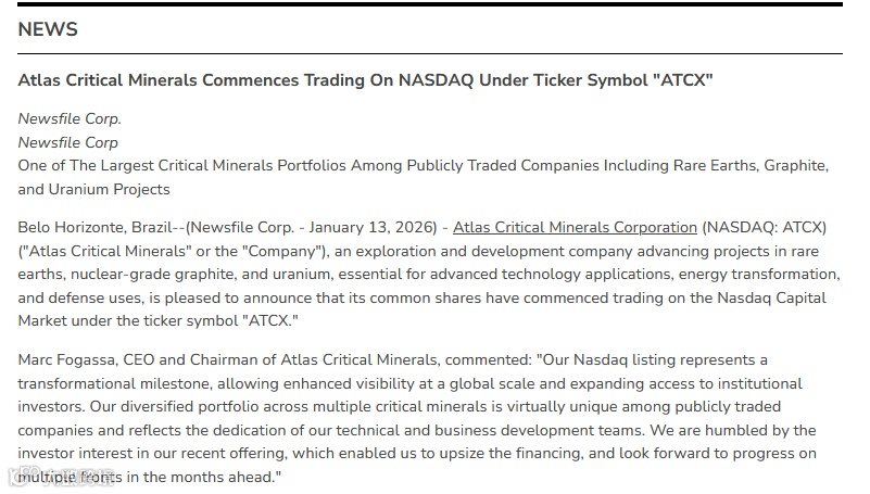 2026年1月9日,巴西关键矿产企业Atlas Critical Minerals(股票代码ATCX)成功从美国OTCQB市场转板纳斯达克主板,树立行业标杆。成立于2016年的该公司专注稀土、核级石墨及铀矿开发,自2025年9月披露转板计划至正式挂牌仅耗时4个月,以8美元/股发行120万股募资1000万美元,市值达4000万美元。