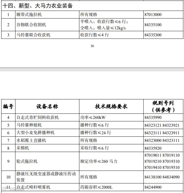 自2025年3月1日起,工信部等五部门《调整重大技术装备进口税收目录》将11类农业装备(含履带式拖拉机、260马力及以下轮式拖拉机等)移出免税目录,不再享受进口免税待遇。