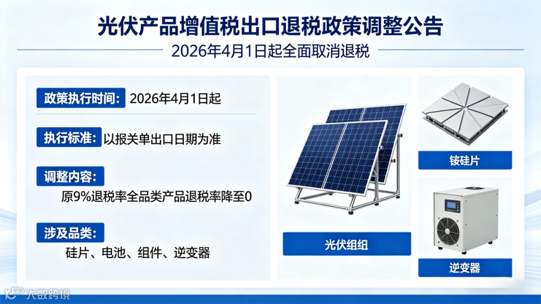 2026年4月1日起,财政部、税务总局全面取消光伏产品增值税出口退税。硅片、电池、组件、逆变器等全品类退税率降至0%,执行以报关单出口日期为准。