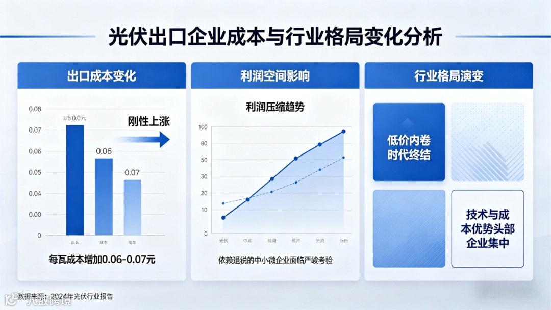 取消退税导致出口成本每瓦增加0.06-0.07元,显著压缩利润空间。中小微企业面临生存挑战,行业低价竞争终结,市场加速向技术与成本领先的头部企业集中。