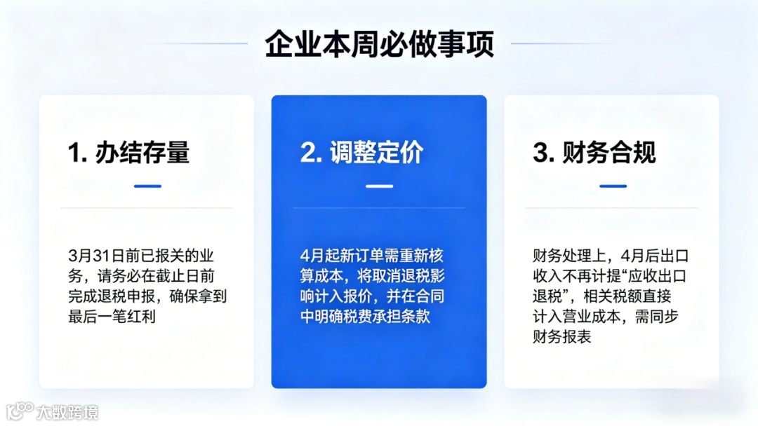调整财务处理:4月后出口收入不再计提“应收出口退税”,相关税额直接计入营业成本,同步更新财务报表。