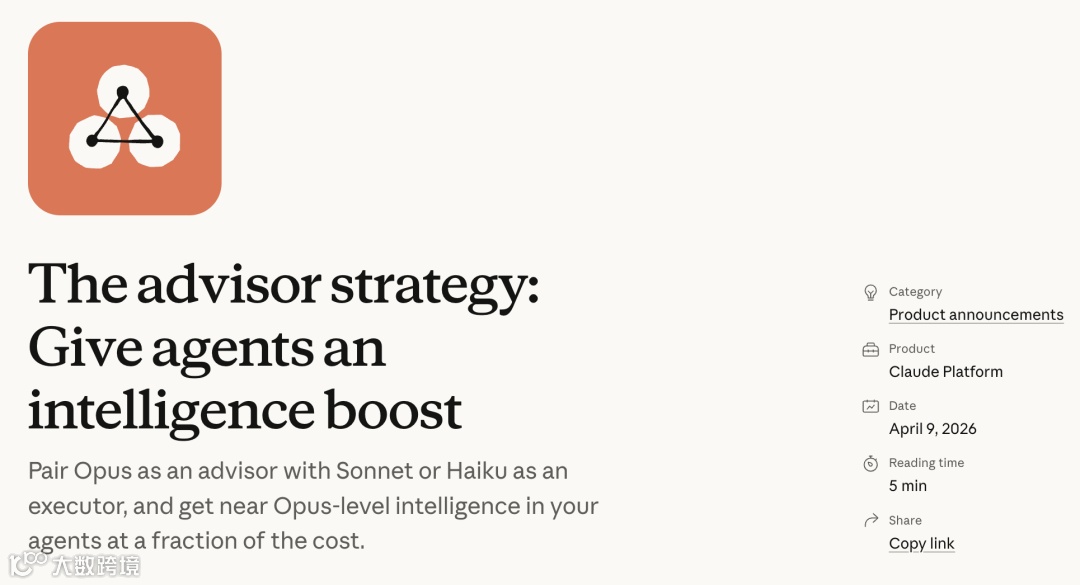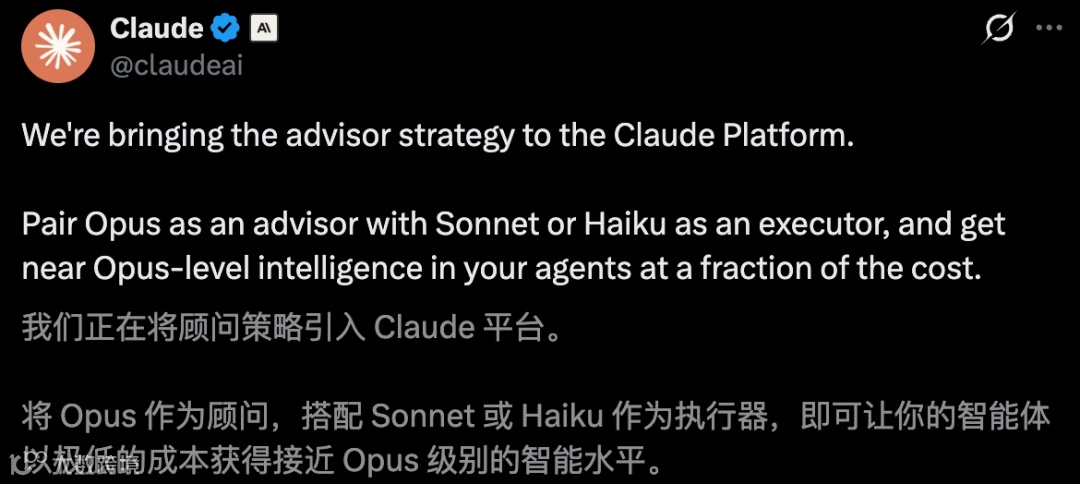 Anthropic正式推出Claude"顾问策略"(Advisor Strategy),重构了多模型协作逻辑: