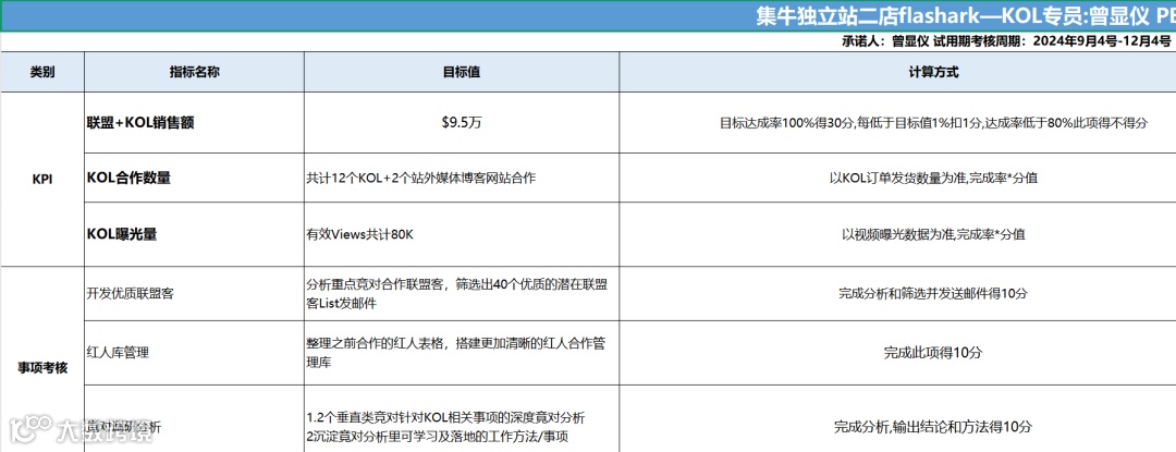 设定9.5万美元KOL+联盟渠道销售目标,达成率低于80%则绩效归零。