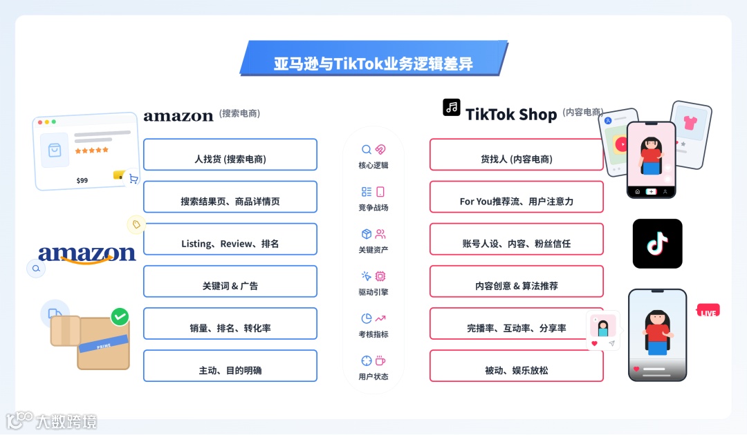 亚马逊采用搜索驱动的货架式电商模式,用户目标明确,依赖关键词搜索、价格比较及评价决策,本质为人找货;而TikTok Shop是内容驱动的兴趣电商,用户无购物意图,需通过短视频前3秒抓取注意力触发冲动消费,本质为货找人。卖家若套用亚马逊逻辑运营TK,忽视内容种草规律,极易亏损。