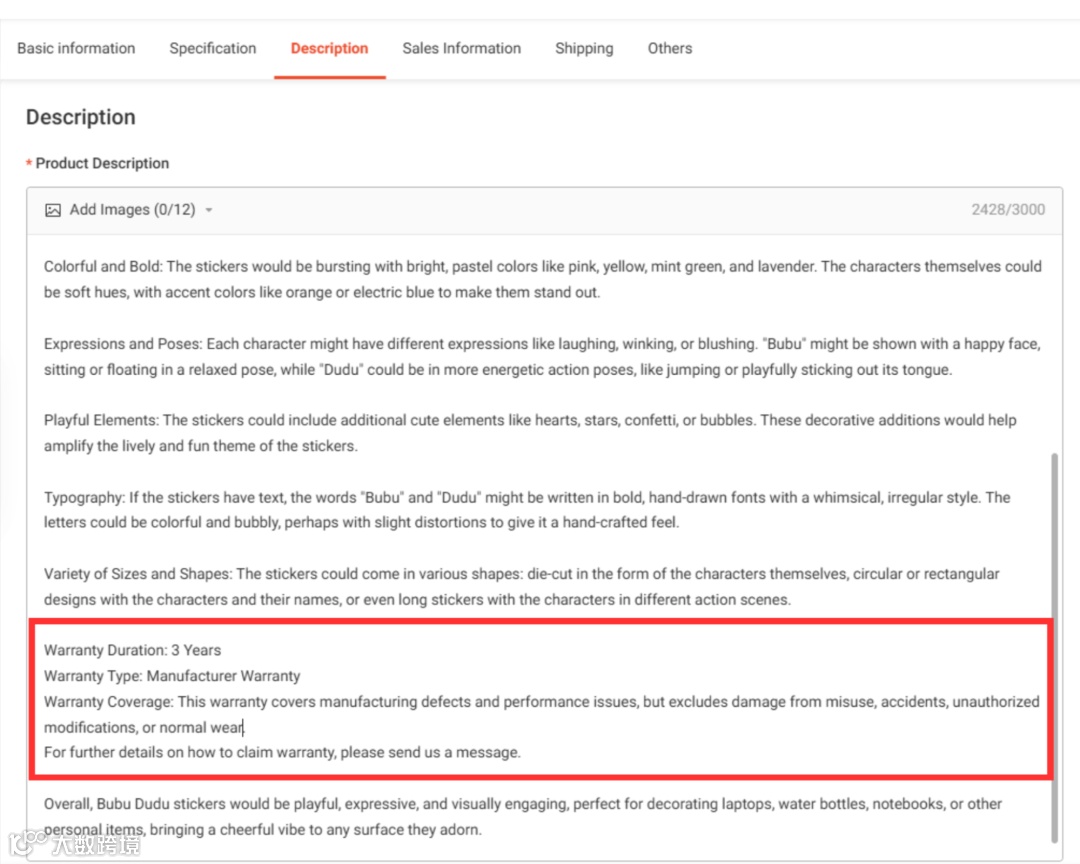 - 在“商品描述”部分填写完整保修条款。