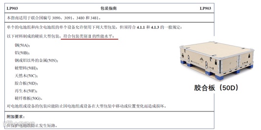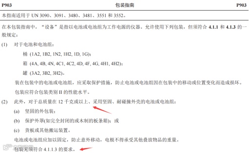 按P903导则运输包含P903(1)和P903(2)两类条款:P903(1)要求采用II类UN包装;质量≥12kg的柜式电池可适用P903(2),此时无需符合UN包装性能要求。