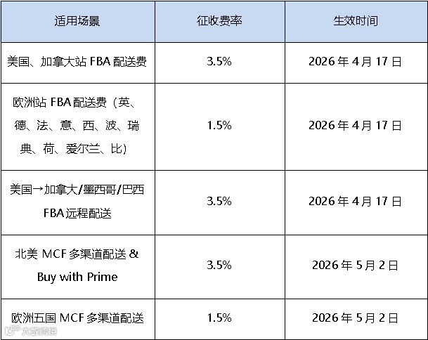 亚马逊宣布自4月17日起对北美、欧洲站点FBA配送费征收燃油附加费,5月2日起扩展至MCF多渠道配送及Buy with Prime服务。作为2026年第三次成本上调,此举将显著影响跨境电商卖家的运营成本与利润。