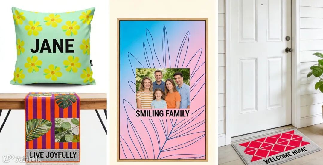 选品定位优先:抱枕、装饰画、桌旗、门垫(门槛低、利润高、易出单)风格:自然清新 + 多巴胺撞色,双风格覆盖主流市场卖点:个性化定制(姓名 / 照片 / 标语),提升溢价与转化