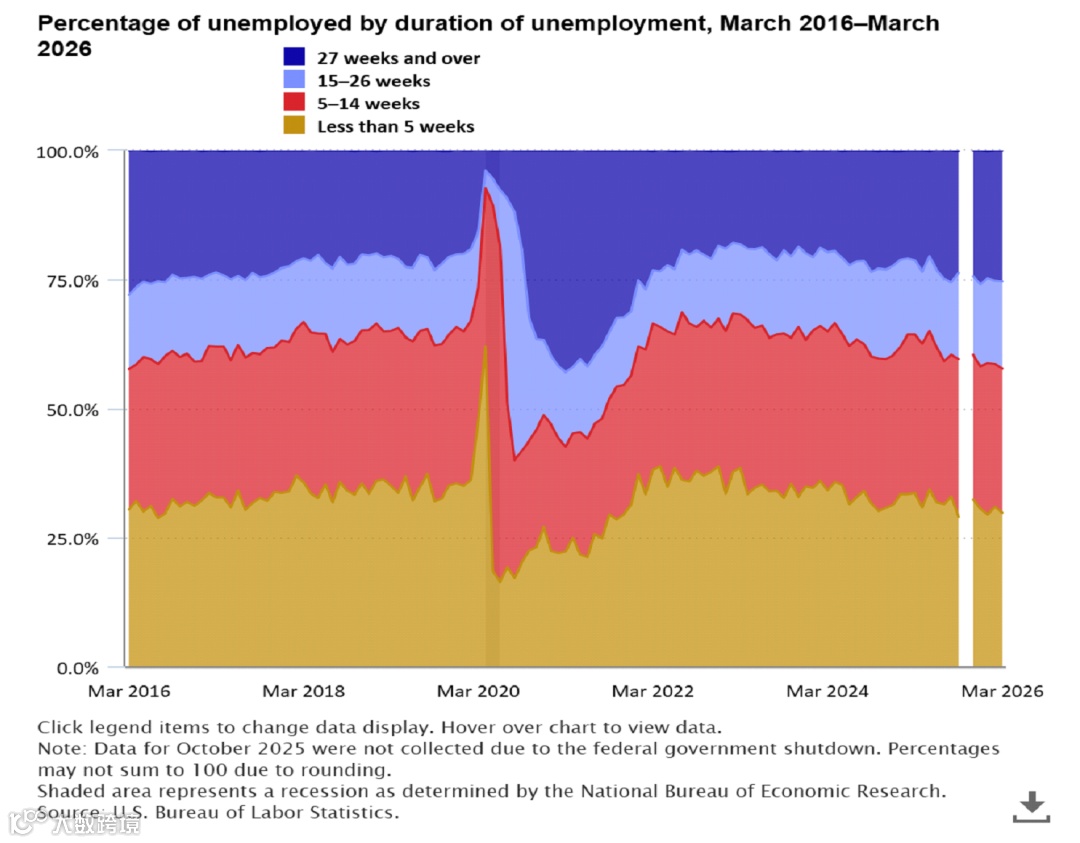 短期失业下降不一定是好消息,而可能是流动性在枯竭。长期失业上升,说明问题开始“固化”,因为失业时间越长,重新就业的概率越低。