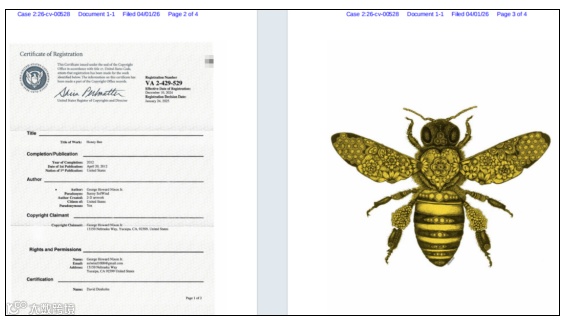 品牌方为美国极具影响力的灵性艺术家、音乐人George Howard Nixon, Jr.,他自幼开启绘画创作,作品充满灵性与自然哲思,擅长以细腻笔触融合自然、神秘主义、萨满文化与生态环保理念。2011年,他在一场灵性仪式中获得蜜蜂形象灵感,以此为核心创作系列艺术作品,旨在唤醒人们对蜜蜂的保护意识,传递自然与神性的联结。该系列蜜蜂作品广泛应用于服饰、文创、装饰等多个领域。本次维权直接锁定349家涉事店铺,是今年以来少见的大批量版权维权案件。