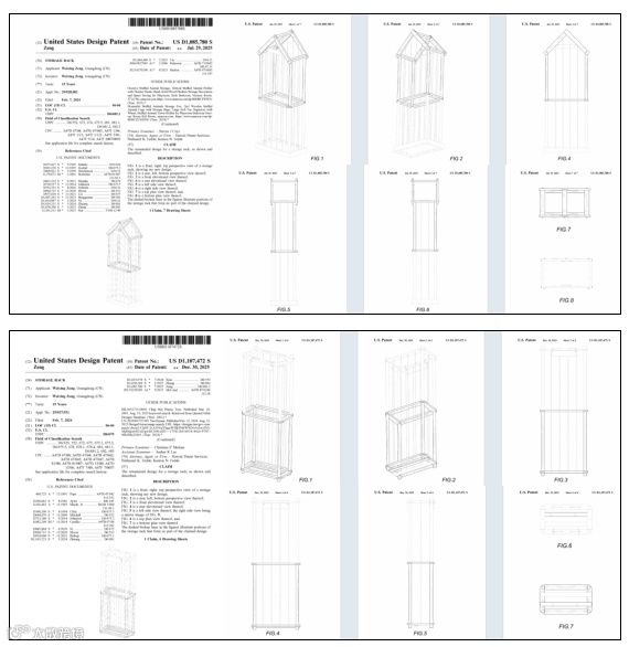 Weixing Zeng(曾伟星)是来自广东的资深跨境卖家,深耕储物收纳用品领域多年,精准洞察家长面对毛绒玩具杂乱、收纳不便的痛点,自主研发设计两款毛绒玩具收纳架,凭借实用化设计迅速成为跨境爆款。本次维权核心涉及2个毛绒玩具收纳架外观专利(专利号:D1085780、D1107472),维权范围覆盖美国市场全渠道销售,涉事卖家需重点自查。