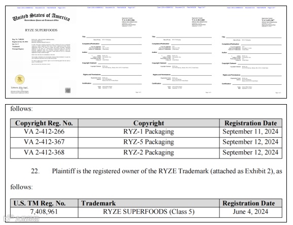 本次维权行动主要聚焦于两大侵权行为:一是未经授权使用Ryze品牌咖啡的“RYZE SUPERFOODS”商标;二是侵犯其3项注册版权(版权号:VA 2-412-266、VA 2-412-367、VA 2-412-368),维权重点针对eBay和Shein平台上的跨境卖家。