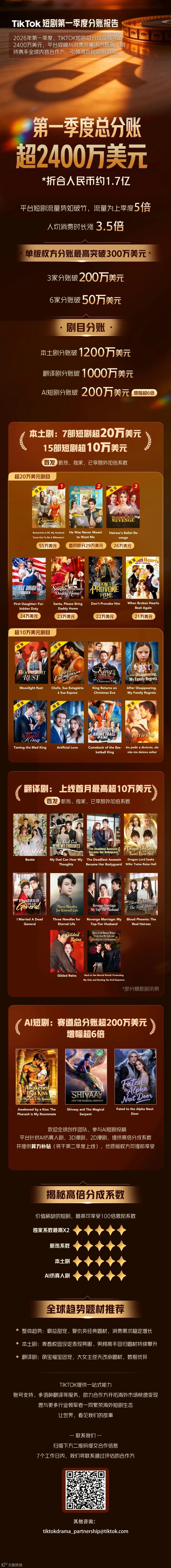从季度总分成突破2400万美元,到本土、翻译、AI三大赛道均表现亮眼;从头部版权方单季度吸金300万美元,到AI短剧实现超6倍爆发增长——这份Q1成绩单,不仅展现出TikTok短剧生态的高速发展,更再次释放出一个明确信号:全球短剧内容出海的红利窗口仍在。