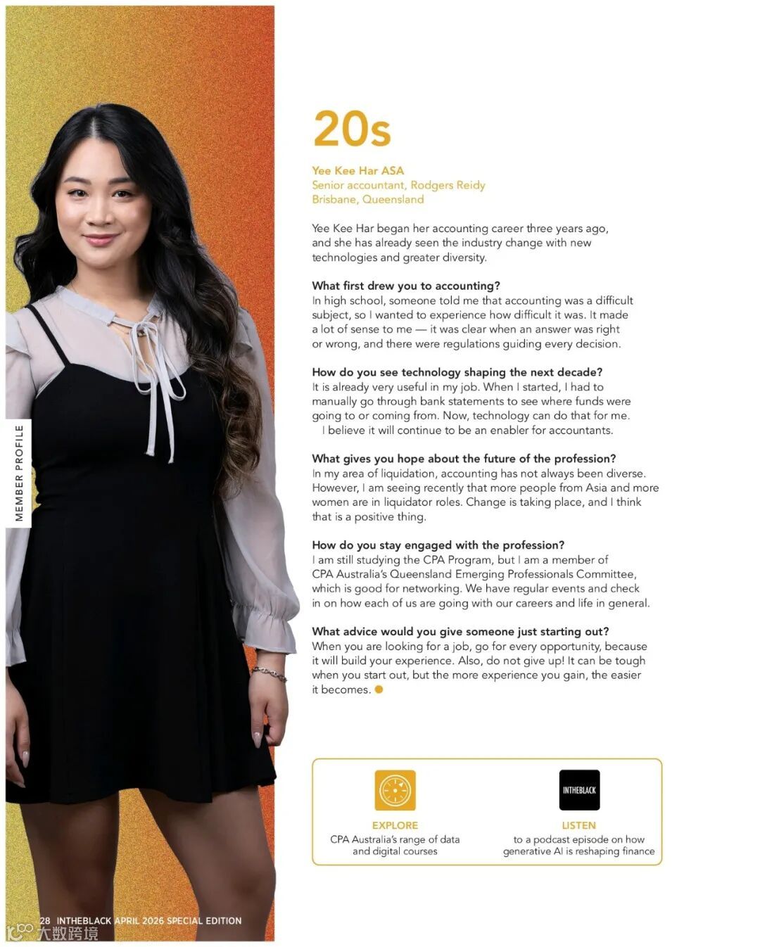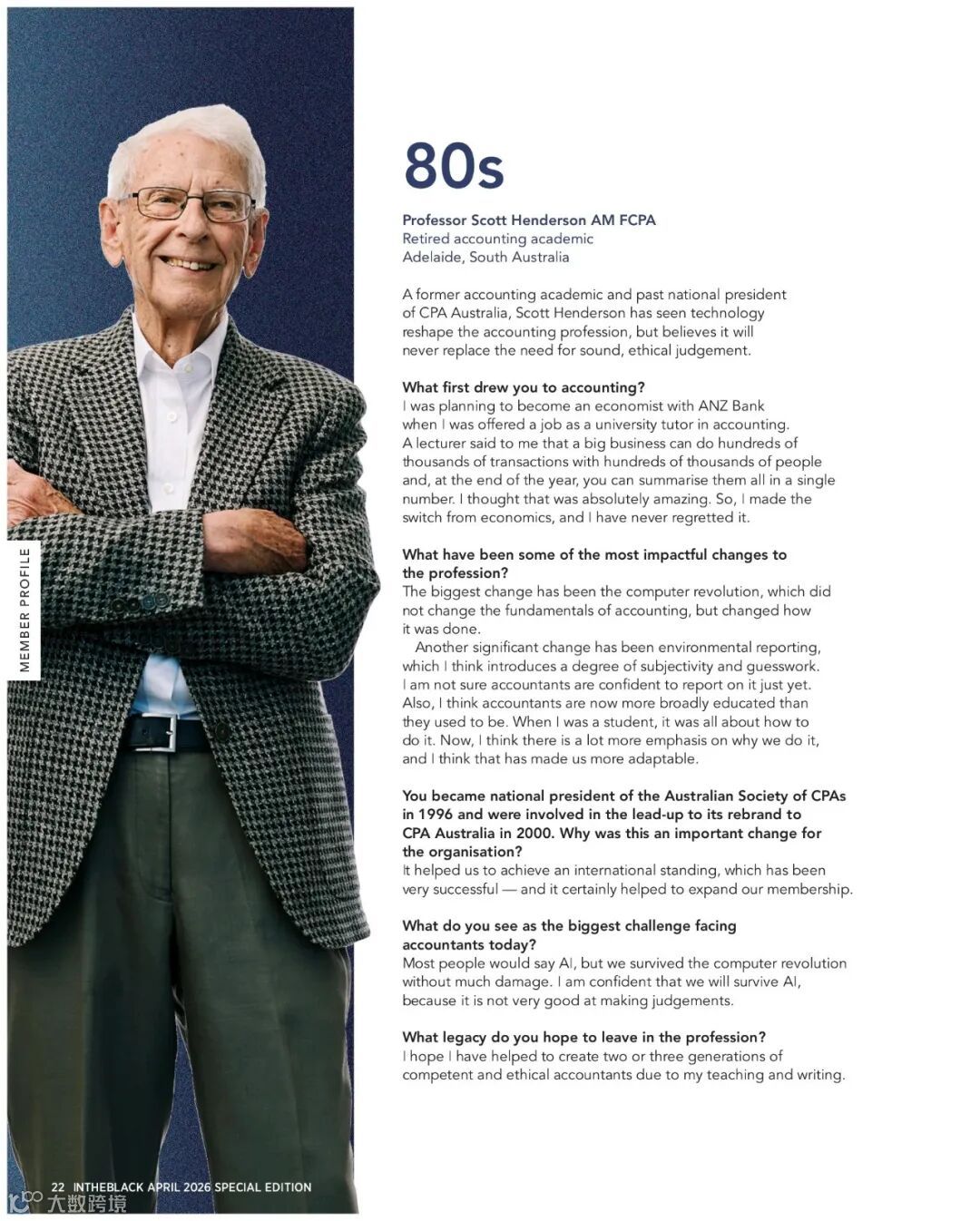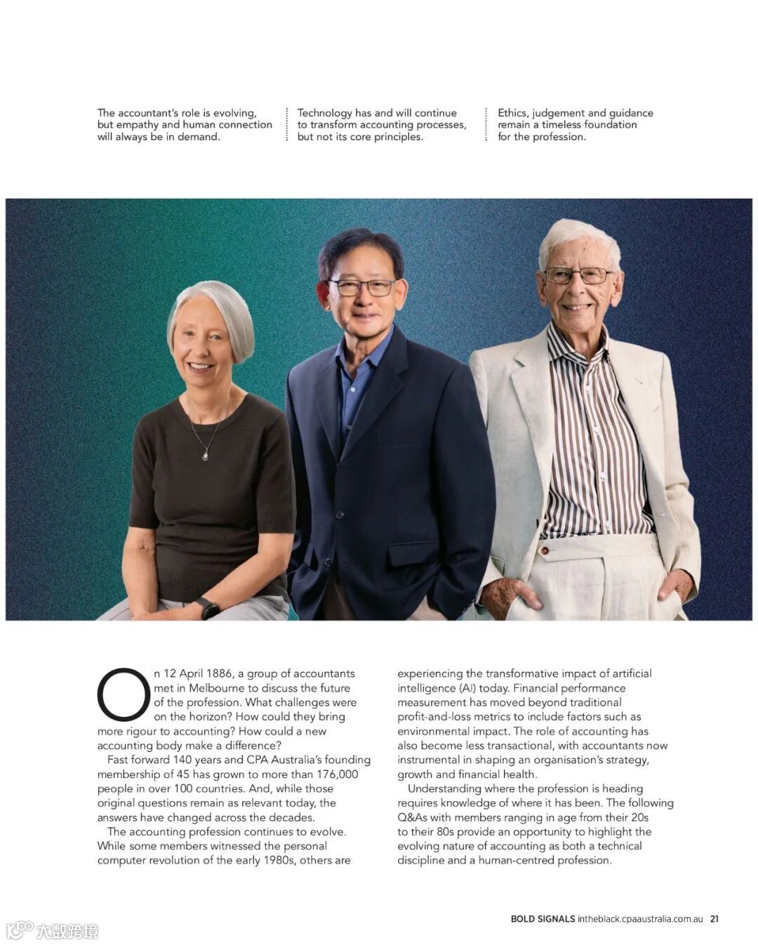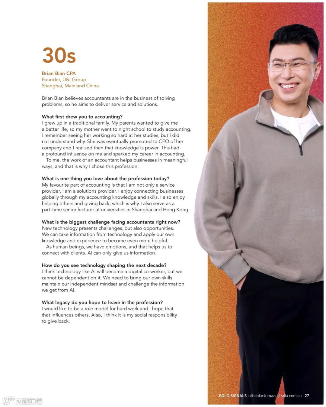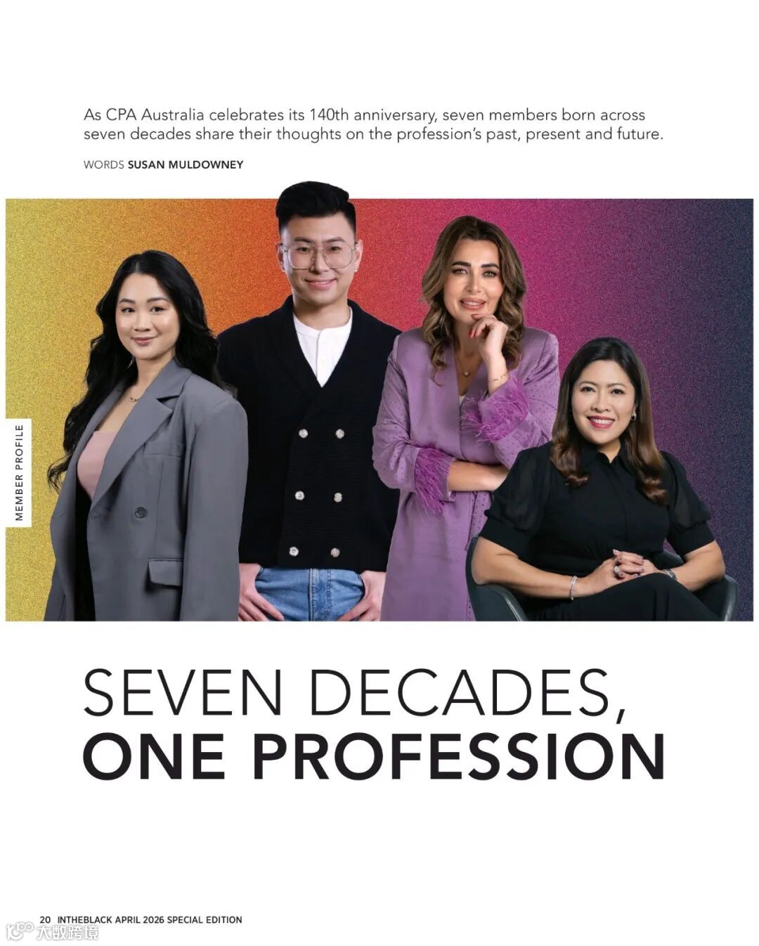 2026年,澳洲会计师公会(CPA Australia)迎来140周年华诞。这一里程碑时刻不仅见证了全球会计行业的百年变迁,更镌刻着公会从1886年创立至今,从区域性专业组织成长为全球领先会计团体的辉煌历程。为庆祝成立140周年,公会参访了七位横跨七个年代出生的会员分享了他们对这个行业过去、现在与未来的思考。作为30岁代际且唯一来自中国的代表,U&I GROUP(汇智集团)创始合伙人、集团副总裁兼汇智研究院院长边疆先生与来自全球不同时代的同仁同框荣登公会140周年特别版纪念杂志。