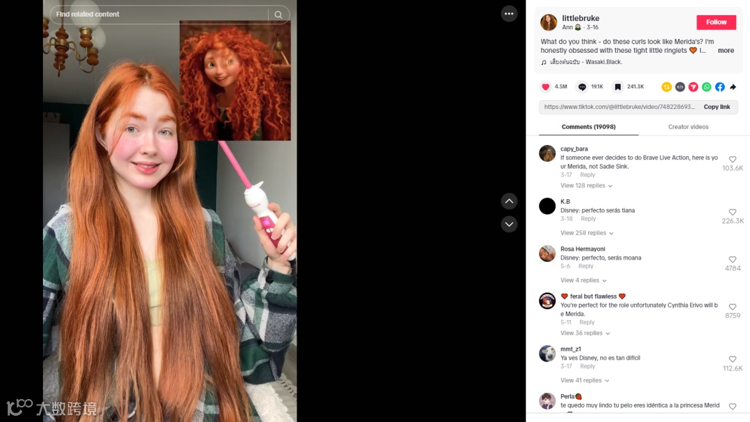 例如TikTok美护达人@littlebruke,她就视频中用Wavytalk卷发棒还原《勇敢传说》动画角色梅里达,通过使用Wavytalk卷发棒还原标志性的紧致小卷发型,将产品自然融入角色造型挑战中。