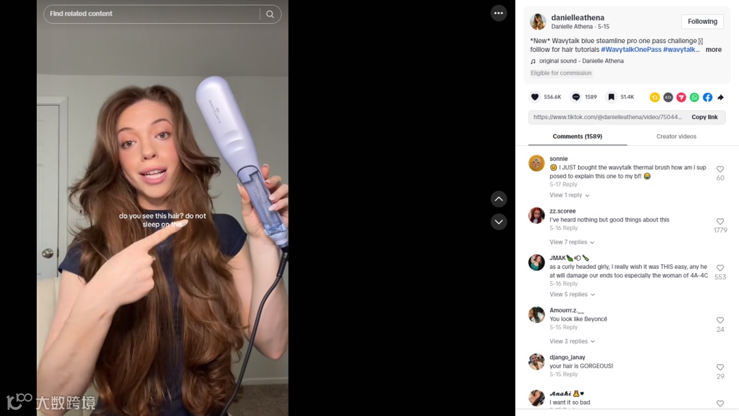 合作视频中,@danielleathena以Wavytalk蒸汽发梳的“一次性拉直挑战(one pass test)”作为内容切入点,通过反直觉问题引发卷发人群的兴趣与好奇。